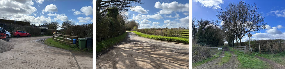 When you reach the wooden barrier, continue straight ahead onto the concrete farm track, bearing slightly left. Follow this track as it carries on and eventually merges with a quiet country lane. Be mindful when crossing here — there are two blind corners, so take a moment to check for traffic before continuing.