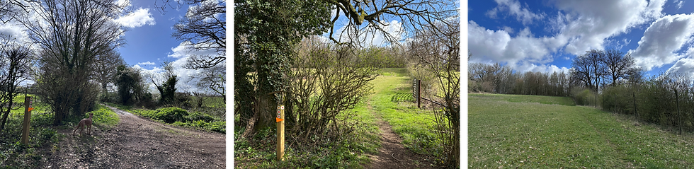 When you reach a junction of several footpaths and bridleways, ignore the wide gravel tracks. Instead, look for a small gap in the hedge on your left and take the narrow footpath (yellow arrow) up into the meadow, keeping the deer fence on your right as you climb.