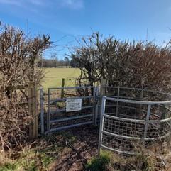Continue ahead into the next field and after 100m look for a metal kissing gate concealed in the hedgerow on the right. Go through the gate and proceed downhill diagonally across the field. Go through a metal farm gate into the lower field and walk along the right side. Exit through a gate and turn right onto the lane.