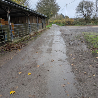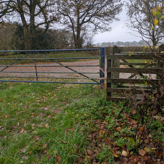 Continue on the track, passing through a complex of farm buildings. Just before the farm driveway meets the road take the gate/footpath to your right, following the edge of the field keeping the hedge on you right.